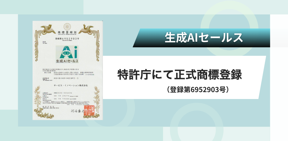 「生成AIセールス」は、特許庁により 正式に商標登録(第6952903号) された唯一のAI営業DXソリューションです。営業活動の標準化・効率化・成果最大化を実現する仕組みとして、今後さらに多くの企業で導入が進むことが期待されます。