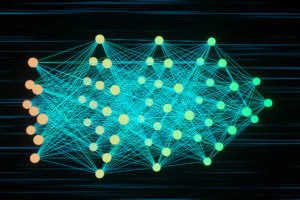 Layers of glowing nodes interconnecting to next layer of neurons by bluish green lines on black background. Illustration of the concept of deep neural network and generative artificial intelligence