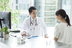 Doctor talking about results of brain examination in patient Doctor talking about the results of the brain examination in patient
