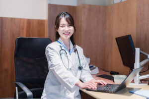 Female practitioner waiting for a patient in the examination room Female practitioner waiting for a patient in the examination room