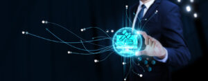 Legal Technology: Businessman Touching Digital Global Network of Legal Data Exchange. Integration of Legal Services on Social Network Connection with Hologram Modern Interface.
