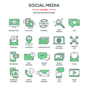 Communication, social media and online chatting. SMS, phone call, messaging in smartphone messenger application. Computing, email web services support. Thin line icons set. Vector illustration.