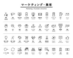 There are icons related to business, strategy, promotion, advertising, data analysis, SNS, services, etc.