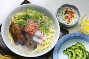 Soruki is an Okinawan food, prepared by stewing pork spare ribs with Awamori. Sauche soba buckwheat noodles in Okinawa soba.