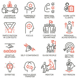 Vector set of linear icons related to skills, empowerment leadership development and qualities of a leader. Mono line pictograms and infographics design elements – part 5