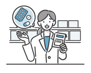 Vector illustration of pharmacist’s bust up explaining medicines and medicine notebooks at pharmacies / doctors / medical staff