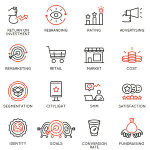 Vector set of linear icons related to business management process, advertising promotion and marketing. Mono line pictograms and infographics design elements – part 8
